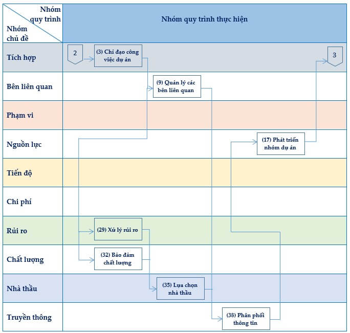 - Nhóm chủ đề quản lý bên liên quan: bao gồm các quy trình cần có để nhận diện và quản lý những người, nhóm hoặc tổ chức có thể tác động đến hoặc chịu ảnh hưởng bởi dự án.