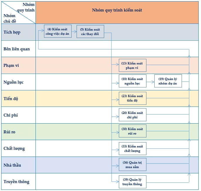 - Nhóm quy trình kiểm soát: được sử dụng để theo dõi, đo lường và kiểm soát kết quả thực hiện dự án so với kế hoạch dự án; đề ra các hành động khắc phục và phòng ngừa, khi cần thiết, để đạt được các mục tiêu của dự án.
